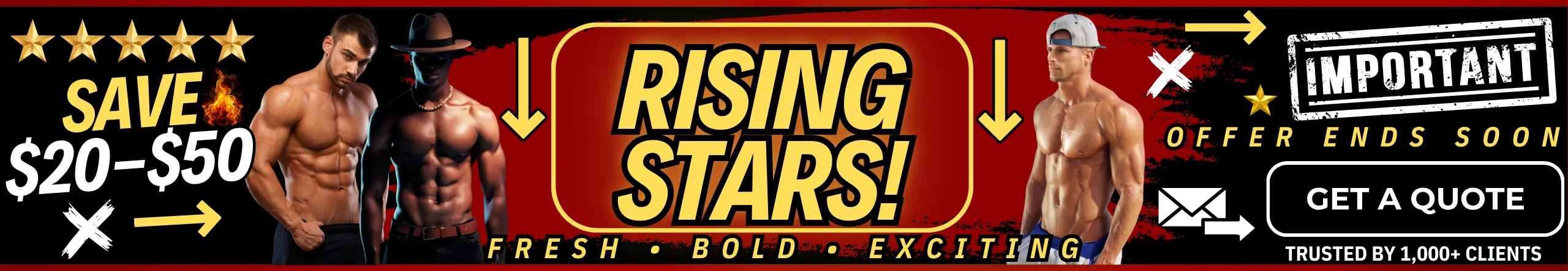 Discover our most popular entertainment choices—from high-energy male strip shows to buff butler service, shirtless bartenders, party bus performers, and so much more—all available at special discounted rates.